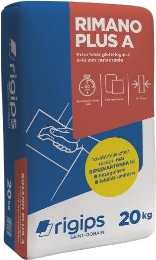 Rigips Rimano Plus A univerzális felületkiegyenlítő - 20 kg - fehér - gipszbázisú portermék - tégla-, beton-, új vagy felújítandó mész-cement vakolatú fal- és mennyezetfelületek egyenetlenségeinek kitöltésére - beltéri felhasználásra - repedés- és zsugorodásmentes felület - festhető - felhordási vastagság: 0-10 mm - anyagszükséglet: 0.95 kg/m2/mm - bedolgozhatósági idő: 60-90 perc